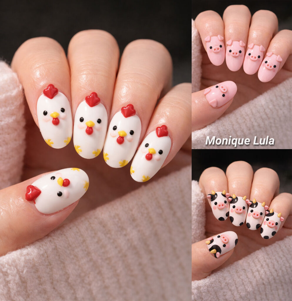 Cow Nails balance it all out with classic black-and-white patterns, cute faces, and a bold graphic look that ties the whole farm theme together.