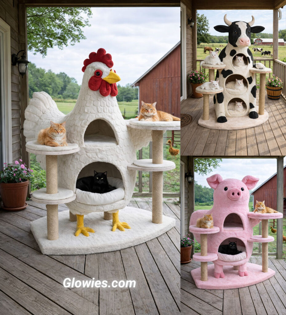 Cats and other small pets love the interactive design, using the structures for play, exercise, and relaxation throughout the day. Whether it’s a chicken-shaped perch, a pig-themed hideout, or a cow-inspired climbing tower, these farm animal cat trees combine fun, function, and charm. They encourage healthy movement, spark curiosity, and give pets their own special space that feels both exciting and comforting. 🐔🐷🐮